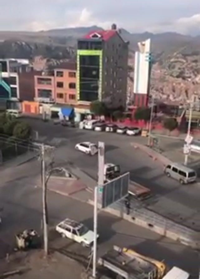 n elevated view of a street intersection in a city nestled within a hilly landscape. Several cars, including vans and a flatbed truck, are moving or parked at the intersection. The buildings around the intersection have a mix of colors and architectural styles, with one building standing out due to its green and gray facade and red roof. Utility poles and overhead wires are visible, along with sidewalks and pedestrian areas where people can be seen walking. The sky is overcast, suggesting it might be early morning or late afternoon.