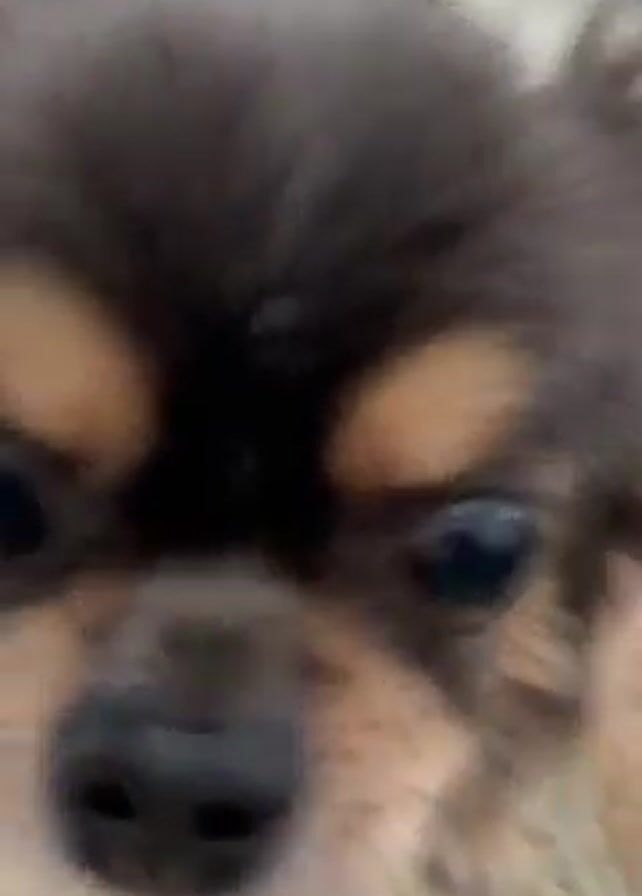 A small dog with long black and brown hair walks on a beige rug. The camera focuses on its face and zooms in very close to its eye.