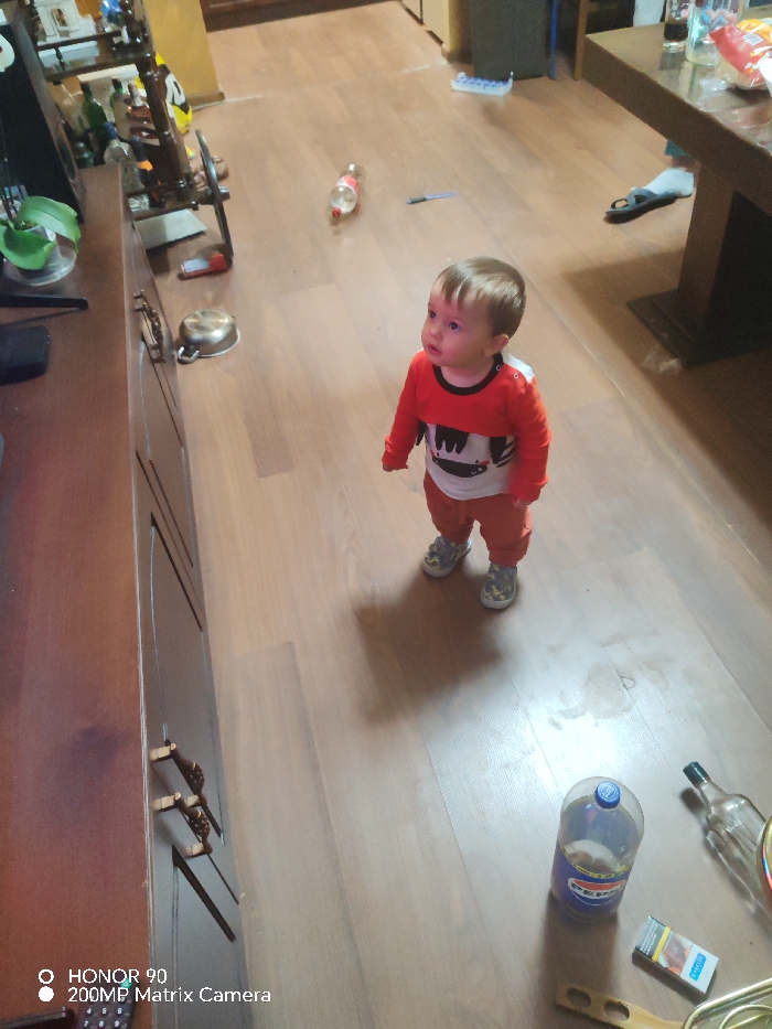 The scene is an interior domestic setting, likely a living room or dining area. One male toddler, appearing to be approximately 1-2 years old, stands centrally on a light brown wooden or laminate floor. He wears a red long-sleeve shirt with a white and black graphic design across the chest, red trousers, and grey and white sneakers. The child's head is tilted slightly back, and his gaze is directed upwards and slightly to the viewer's left. To the left of the frame, a dark brown wooden cabinet or dresser is visible, featuring two prominent, ornate handles. On the cabinet's surface, a green potted plant (possibly an orchid) is present, alongside various bottles and other obscured objects. A decorative, antique-style wooden spinning wheel is positioned behind the cabinet's top edge. A metallic pot with a handle lies inverted on the floor near the base of the cabinet. In the background, a dark wooden table leg and the underside of the table surface are partially visible. A white slipper and a transparent bottle are located underneath the table. Further back, a red plastic bottle and a blue pen are positioned on the floor behind the child. In the lower right foreground, a large plastic bottle with a blue cap and a partial Pepsi label is visible, along with an empty clear glass bottle. An open pack of cigarettes, with Marlboro branding discernible, rests on the floor next to a small wooden spatula-like utensil. A damp stain is evident on the floor surface in this area, adjacent to the scattered items. The lighting suggests an indoor artificial source or soft natural light.