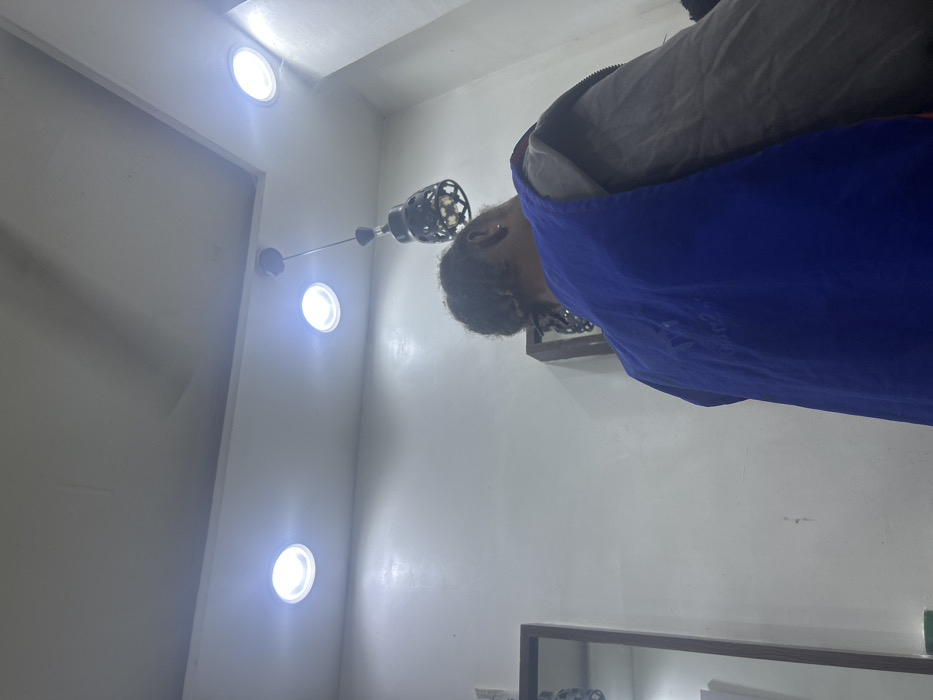 A person wearing a blue garment and grey clothing stands in a room. Overhead, a track lighting system with spherical bulbs illuminates the space. The walls are painted white, with a large mirror visible at the bottom. The mirror reflects several objects, and a small green object sits on a surface to the right.