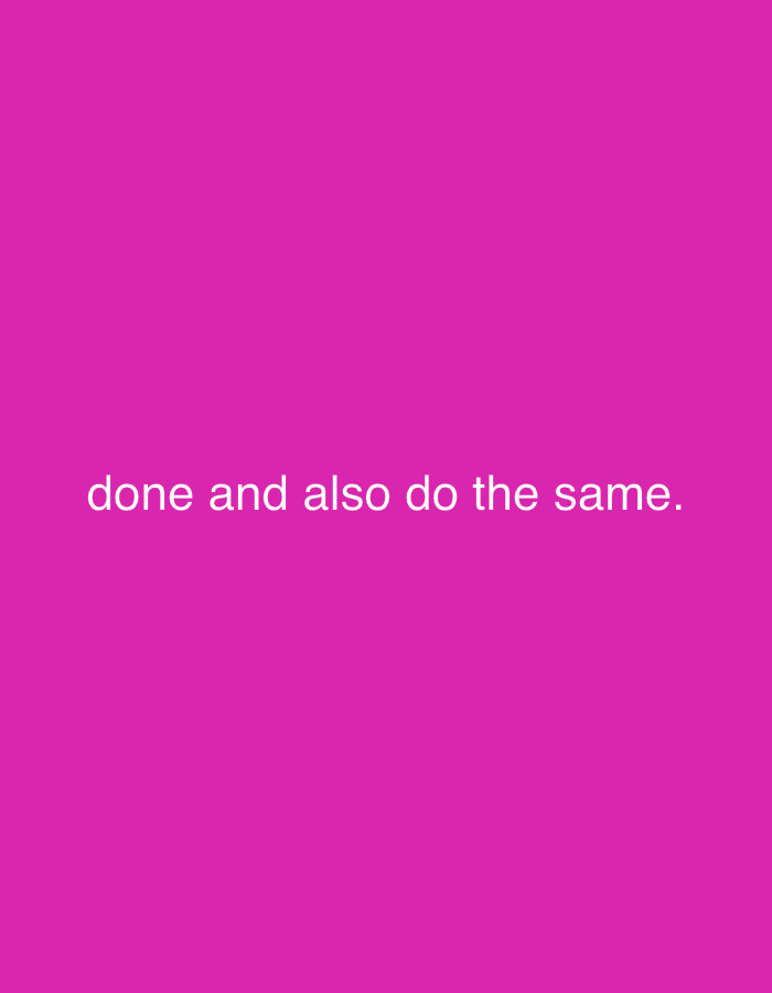 A vivid magenta background serves as the canvas for a simple, yet impactful message. Centered horizontally and vertically, the words "done and also do the same." are displayed in a clean, sans-serif font. The white lettering contrasts sharply against the pink background, ensuring readability and drawing attention to the concise directive. The overall composition is minimal and straightforward.