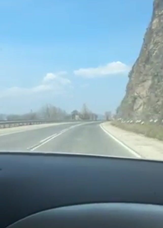 view from inside a car driving on a two-lane road. A large rock formation is visible on the right side of the road, while a guardrail runs along the left side. The sky is blue with scattered clouds. Bare trees are visible in the distance. The dashboard of the car is in the foreground.