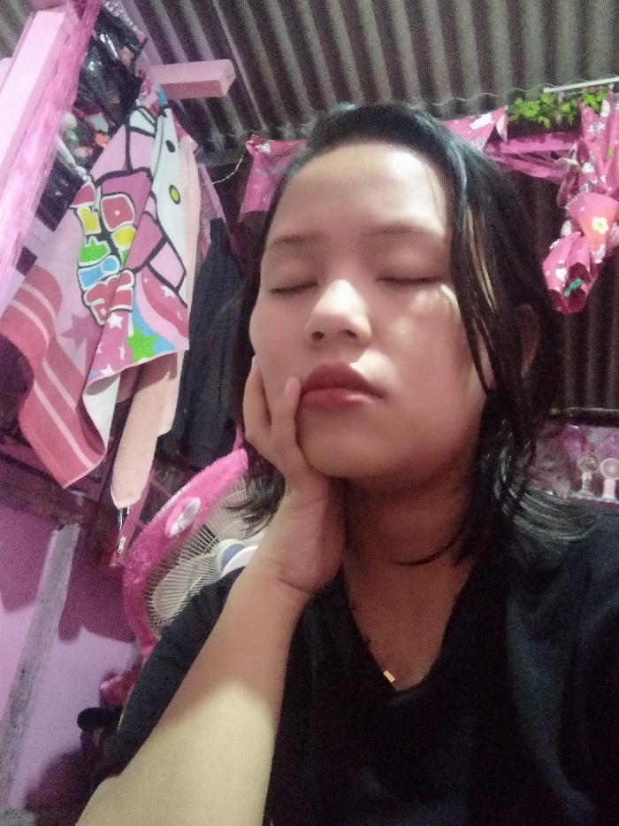 A person with closed eyes rests their face on their hand. They have short, dark hair and wear a black shirt with a delicate gold necklace. The background is filled with various items, including pink accents. A pink fan sits behind the person. The surroundings are cluttered, with items like towels and decorative pieces visible. The overall impression is of someone relaxed in a busy, possibly small, space.