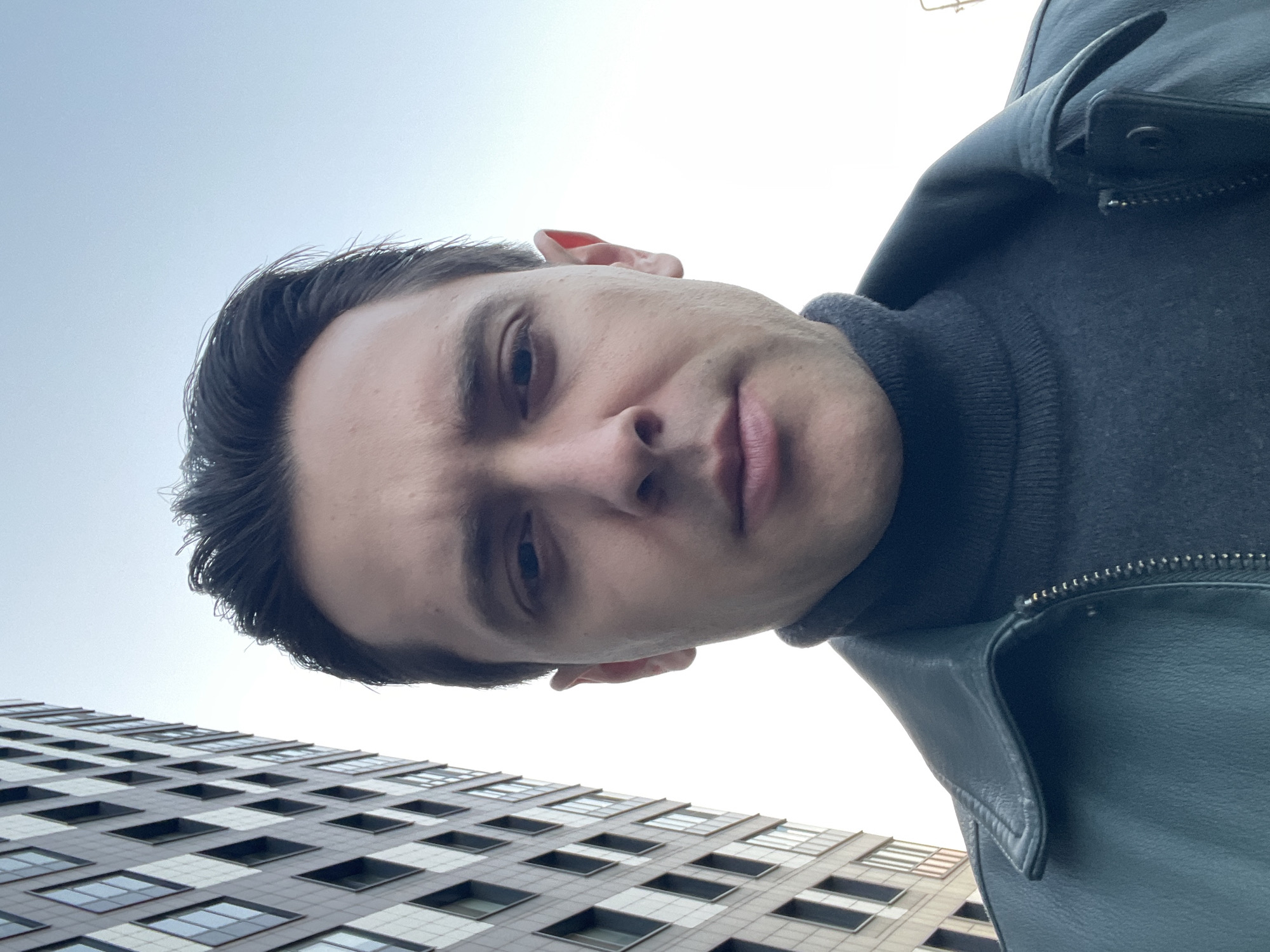 A man is taking a selfie from a low angle. He is wearing a gray turtleneck sweater and a dark gray leather jacket. The background features a modern building with a grid pattern of windows against a cloudy sky. Although the exact building is not discernible without further information, this style of architecture is common in Saint Petersburg, Russia.