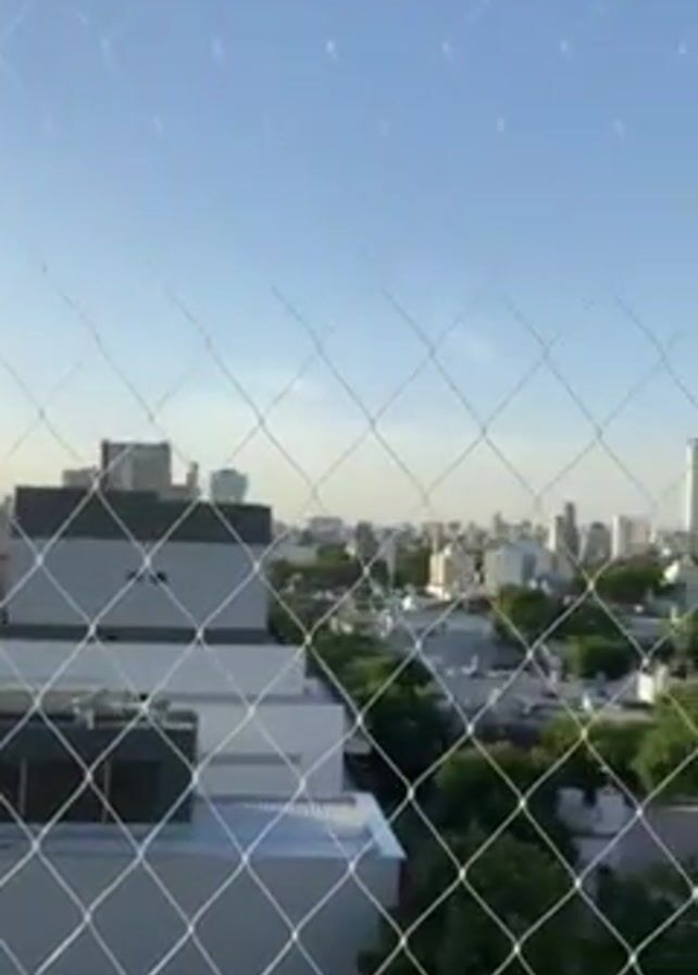 The camera pans slowly from left to right across a cityscape, as viewed through a safety net