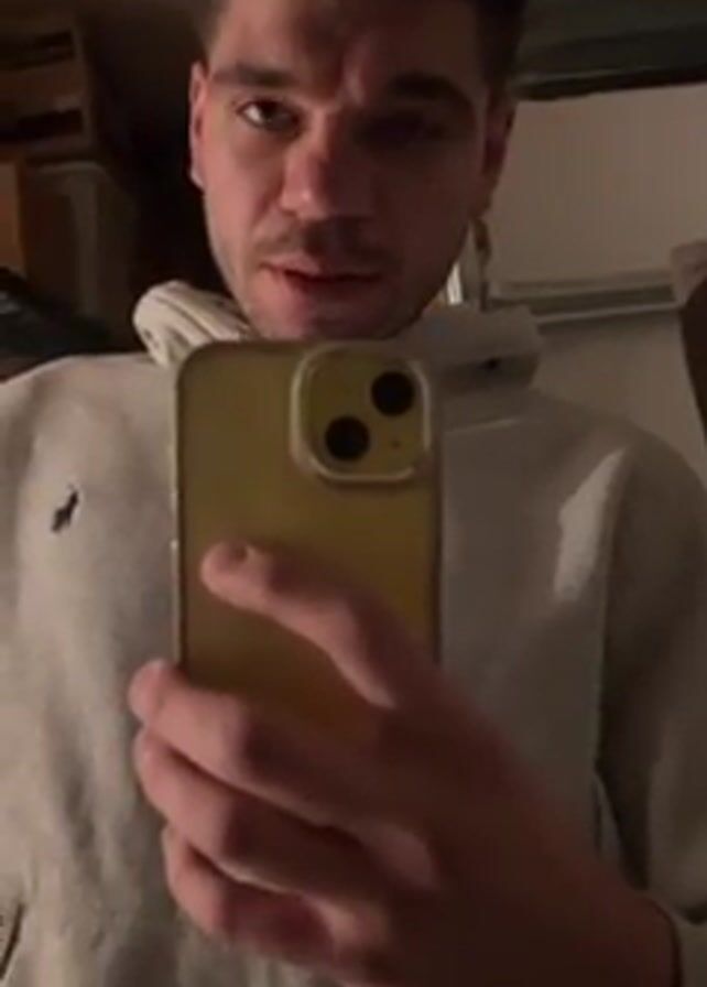 man holding up a phone to record himself in what appears to be a cluttered space. He is wearing a grey hoodie with a small logo on the left chest and has short, dark hair. He looks directly at the camera and speaks the words "I am the worst enemy of myself." The phone he is holding has a yellow case. Behind him, partially visible, are boxes and other items, suggesting a storage area or garage. The lighting is somewhat dim.