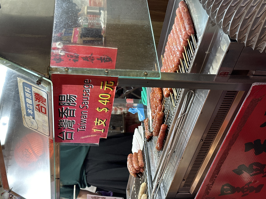 The image depicts a street food stall in New Taipei City, Taiwan, specializing in Taiwan Sausage