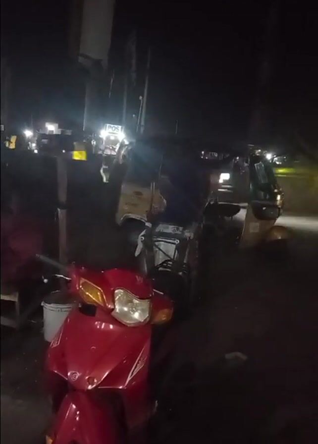 The scene is a dark, nighttime street view. A red motorcycle stands in the foreground, its headlight visible. Behind the motorcycle, there are several "keke" (auto-rickshaws), one of which has the word "AUWABA" and "SUV 955" displayed on it. In the background, a lit-up sign that says "POS" is visible among other lights. A person sits on a stool near the motorcycle, and another person in what appears to be a uniform walks in the background. A tall tower-like structure is also visible in the distance. The scene seems to be a busy street at night.