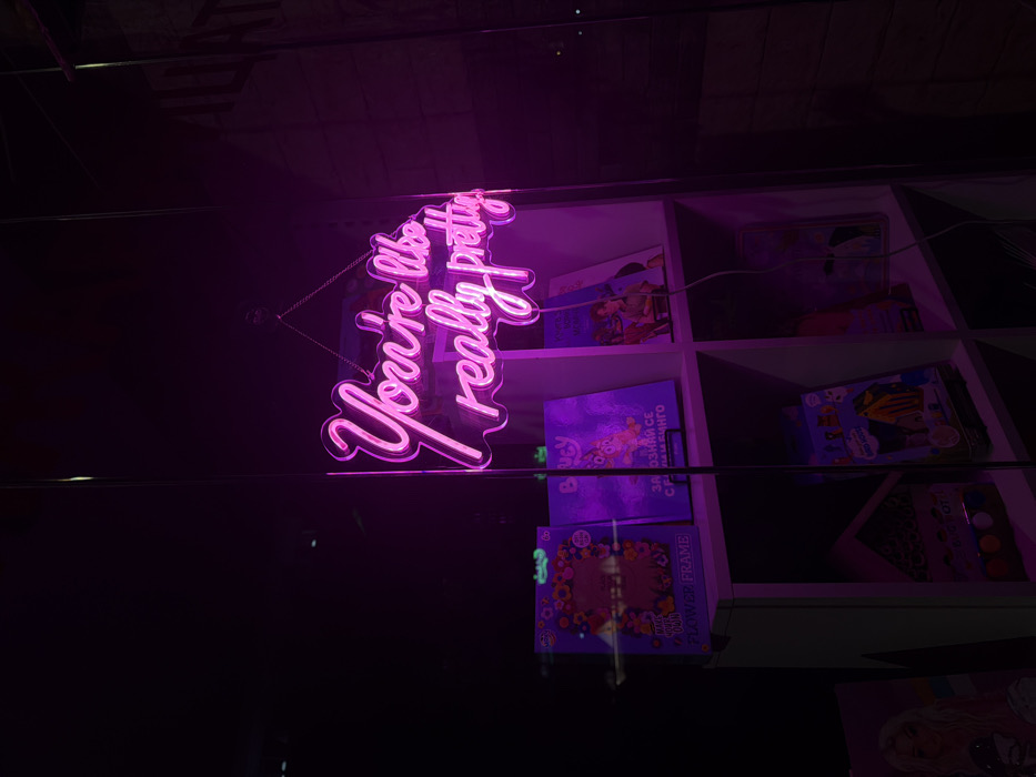 The image depicts a retail display in a store located in Burgas, Bulgaria, viewed through a reflective glass window at night or in low light conditions. A prominent pink neon sign, suspended by a chain in the upper-middle of the frame, reads "You're like really pretty" in cursive script. Behind the neon sign, a white modular shelving unit is visible. On the top shelf, from left to right, are: 1. A product box labeled "MAKE YOUR OWN FLOWER FRAME." 2. A book or package with a purple cover and Cyrillic text partially visible, reading "ЗАПОЗНАЙ СЕ С ЛИЛИ И ВИНГО" (Get to know Lily and Wingo). 3. Another book or item featuring an illustration of two figures. On the bottom shelf, from left to right, are: 1. A product package featuring a female cartoon character, possibly from the "TOPModel" brand. 2. A small, light-colored wooden house-shaped object containing colorful circular items. 3. A product package depicting a character in a yellow raincoat, consistent with the "Bluey" animated series. 4. A partially visible framed item or package on the far right. The overall environment is dimly lit, with the bright pink neon sign providing the primary illumination and casting a magenta glow over the displayed merchandise. No individuals or active interactions are visible within the frame.