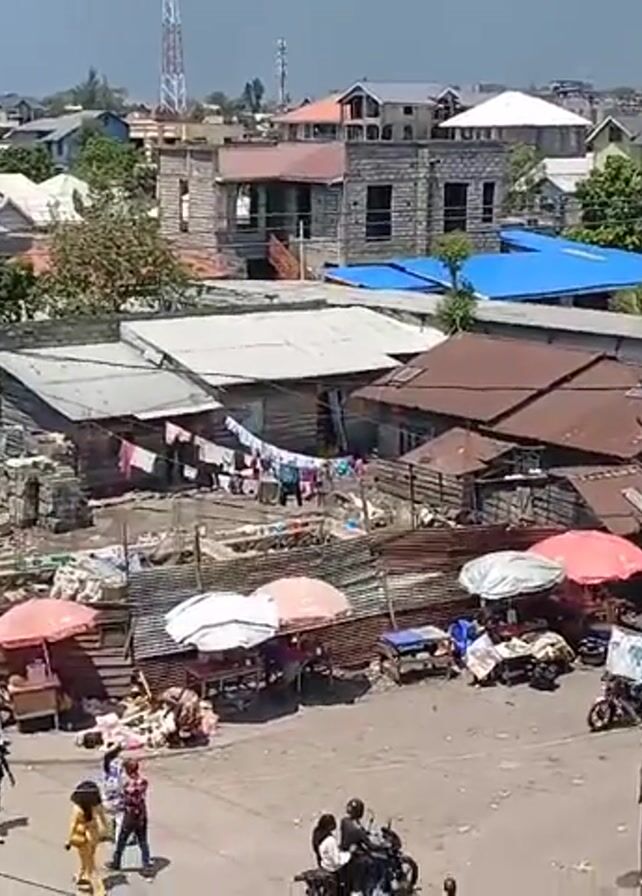 n elevated view of a neighborhood street scene. The street is unpaved, and lined with various small buildings, some of which appear to be residences and others commercial establishments. Clotheslines hang between buildings in one area. A number of stalls are set up along the roadside, covered with umbrellas of various colors, suggesting a market area. People are walking and gathered around the stalls, some appearing to be shopping. Motorbikes are also present on the street, one with a passenger. The buildings have a mix of construction styles and materials, with some appearing more permanent and others makeshift. The sky is overcast, and in the background is a cityscape with buildings of varying heights and a communication tower.