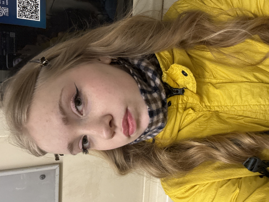 The image displays a close-up portrait of a young female inside what appears to be a public transport vehicle, specifically a metro car, consistent with the Saint Petersburg Metro in Russia. The subject is a female with light skin and long, wavy blonde hair, parted on the side. Two dark hair clips secure a section of hair above her right temple. She wears noticeable makeup, including winged black eyeliner, light pink eyeshadow, mascara, and a light pink lip color. Small hoop earrings are visible in both ears. Her expression is neutral, and she gazes directly forward. She is dressed in a bright yellow hooded jacket, featuring a black zipper and snap buttons on the front and collar area. Around her neck, she wears a brown, black, and white plaid neck warmer or scarf. A black strap with a buckle, possibly from a bag, is visible on the lower left. The background consists of light-colored, likely beige, wall paneling on the left, with a grey rectangular frame attached. To the right and behind her head, a darker, reflective surface shows part of a light blue sign. A black and white QR code is prominently displayed on this sign, with partially visible Cyrillic text above it, including "30 КОП" and "КОМ", reinforcing the Russian context and suggesting a fare or information sign common in metro systems. Reflections in the background indicate an enclosed, possibly moving, environment.