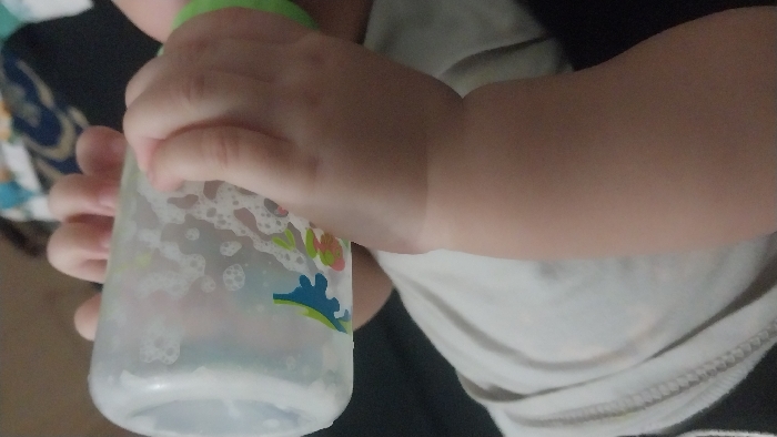This close-up image, taken in Lhoksukon, Indonesia, depicts a baby or young child in an indoor setting. The central subject is a pair of small, plump hands, presumably belonging to the child, gripping a clear plastic baby bottle. The bottle contains a white, frothy liquid, consistent with milk or formula, and is decorated with colorful motifs resembling dinosaurs or abstract animals in blue, green, and orange. A green collar or cap is visible on the bottle. The child wears a light-colored (likely white or light gray) t-shirt or top. In the blurred background, dark fabric, possibly upholstery or a blanket, is visible, along with a patterned blue and white fabric further in the upper right. The child appears to be actively drinking from the bottle.