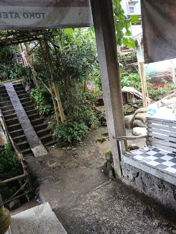 The image depicts an outdoor scene in Unknown, Uruguay, characterized by a sloping concrete pathway and stairs flanked by dense vegetation. In the foreground, a rough concrete surface leads towards the mid-ground. To the left, a set of concrete stairs with an integrated ramp or handrail ascends diagonally towards the upper left, bordered by a rustic wooden railing. The area around the stairs and pathway is heavily overgrown with green foliage, including trees, bushes, and bamboo-like stalks. A concrete pillar stands prominently in the middle-right foreground, supporting an unseen overhead structure, with a sign bearing reversed text "TOKO ATEA" visible at the top edge of the frame. To the right of the pillar, a white wooden bench with a black and white checkerboard patterned seat is positioned. Behind the bench, multiple light-colored sacks and loose rocks are visible, partially obscured by vegetation. Scattered red flowers are present among the greenery in the mid-ground. In the upper background, through the foliage, the outlines of residential structures are discernible. No individuals are present in the scene. The overall environment appears natural and somewhat unmaintained.
