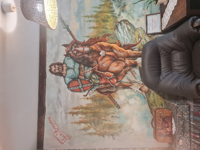 The image presents an interior room with a large, vibrant wall mural depicting the Russian epic hero Ilya Muromets