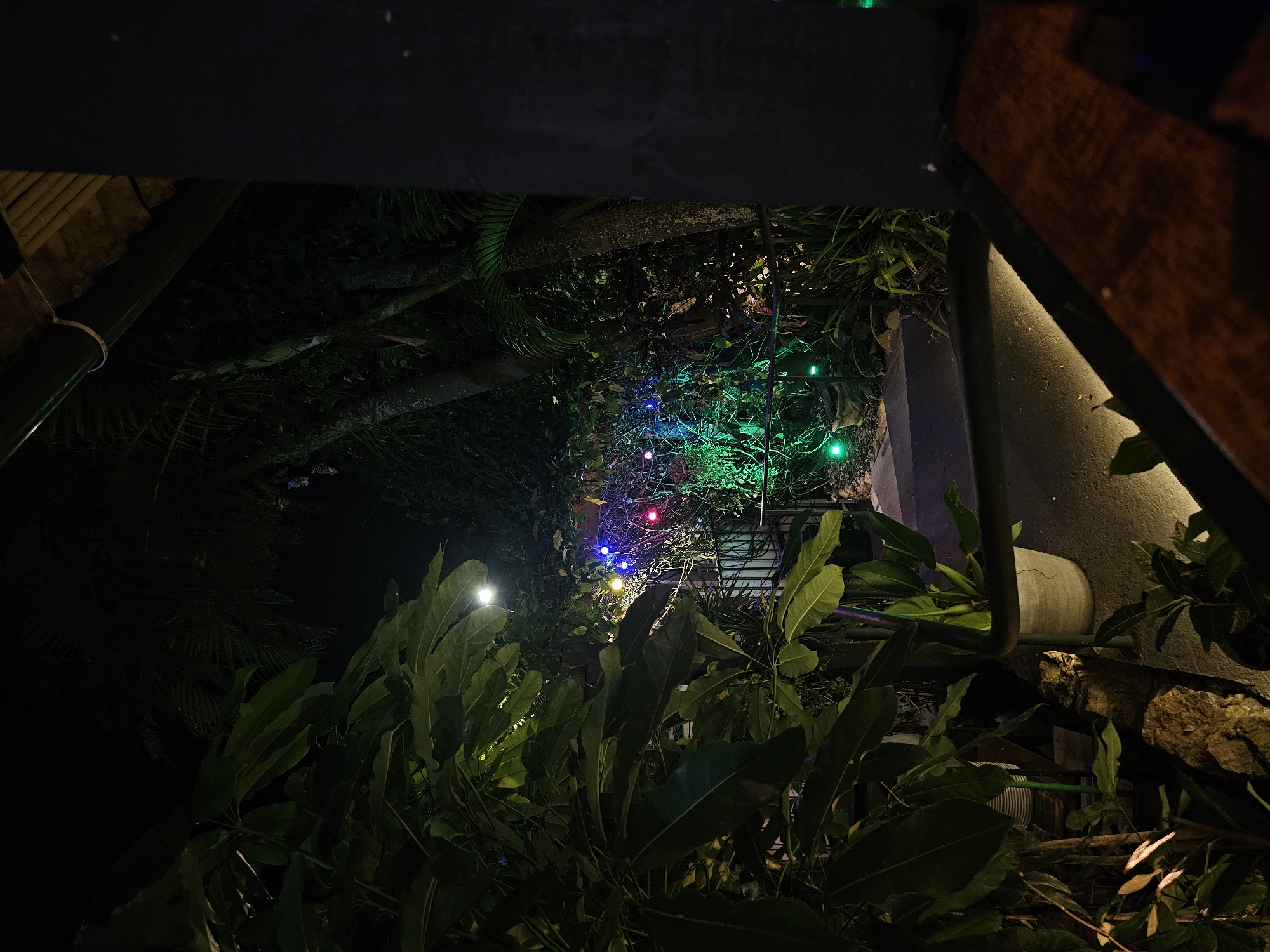 Captured at night, the image presents a view of a garden or outdoor space, possibly in Armação Dos Búzios, Brazil, as specified. Foregrounded are large, dark green leaves, suggesting tropical vegetation. Interspersed amongst the foliage are strings of colorful lights, including hues of blue, green, red, and yellow. The lights appear to be suspended amongst the plants. In the background, elements of the built environment are visible, including what appears to be a building facade, possibly made of concrete or stucco. Above, a dark structural element, likely part of a roof or overhang, frames the view. The overall atmosphere is dimly lit and emphasizes the contrast between the natural elements and the artificial lights.