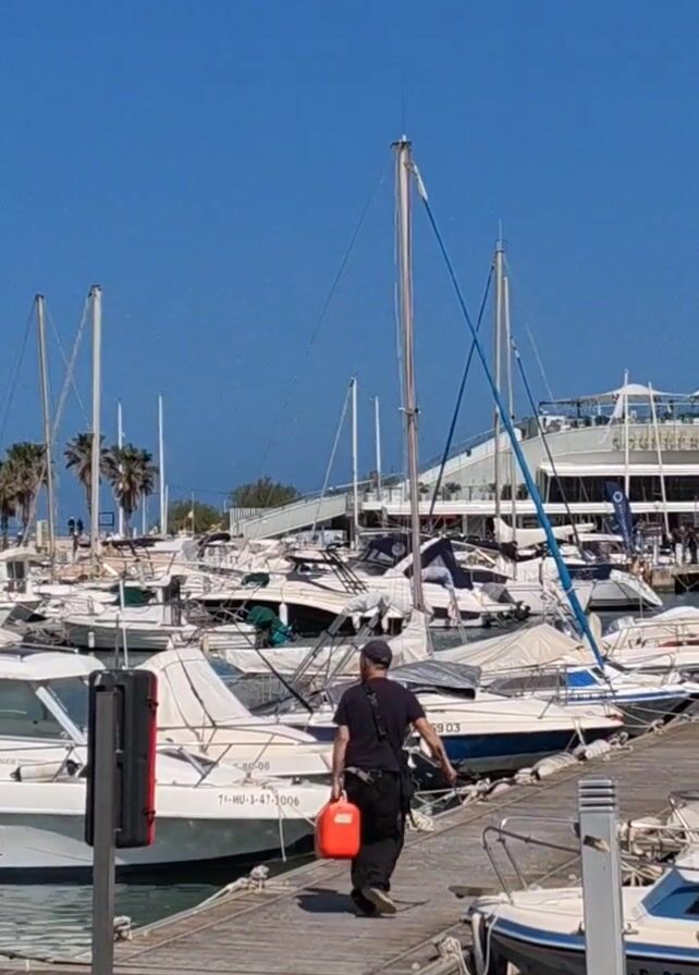 man walking on a wooden dock in a marina. He is carrying an orange canister in his right hand and what appears to be a black tube or hose in his left hand. He is wearing a black shirt, dark pants, and a cap. The marina is filled with various boats, including sailboats and motorboats, many of which are covered with white protective tarps. A multi-level building with a visible terrace is in the background. Another man is visible standing on the dock behind the first man, possibly working on a boat. The sky is clear and blue.