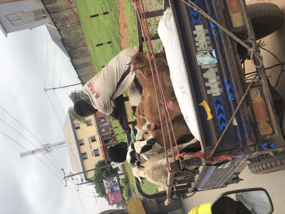 The image displays a blue, three-wheeled cargo vehicle, likely a modified motorcycle, on a paved road in Onitsha, Nigeria, under an overcast sky. The vehicle's cargo bed is occupied by approximately five to seven live sheep and goats of varying colors, from cream to reddish-brown, some with black facial markings. These animals are secured with red and white ropes tied across the top of the metal cage. A large white sack rests within the cargo area. Two young men are positioned near the cargo. One, wearing a white short-sleeved shirt with "A.KAJO" printed in red on the back, leans over the top rail of the cargo cage, facing away from the camera. A second man, with dark, short hair, is partially visible in front of the first, also facing away from the camera. The background features a two-story yellow building with blue window frames, identified by signs reading "CHINA - JERRY COLLEGE" and "CHINA - JERRY SUPERMARKET." To the left of this building, a billboard for "DOLLY HILLS HOTEL" is partially visible. A telecommunications tower with power lines extends into the sky. To the right, a concrete wall topped with barbed wire delineates a grassy area, marked by black and yellow striped bollards. A grey, multi-story building is partially visible on the far right. The immediate foreground shows a yellow object and the edge of a vehicle's rearview mirror, suggesting the photograph was taken from an adjacent vehicle.