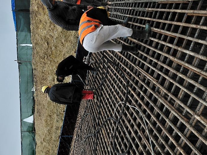 An overhead view captures an active construction site in Sidi Moussa Ben Ali, Morocco, under an overcast sky. The foreground and midground are dominated by a dense, horizontal grid of steel rebar, forming a reinforced concrete slab or foundation structure. Black electrical conduits or hoses run across the rebar mesh. Five individuals are present on or around the rebar structure, engaged in various tasks. On the far left, a person wearing a yellow hard hat, a black coat, and red pants stands on the rebar, facing away from the camera, appearing to oversee or manipulate something within the structure. Adjacent to them, another individual in a dark coat bends over the rebar, actively working with their hands. To the right, a third person in a black hooded puffer jacket also faces away and looks downwards. In the immediate foreground, a person wearing a bright orange safety vest over a dark shirt, light grey pants, and dark rubber boots is deeply bent over, interacting directly with the rebar framework. A fifth person, only partially visible on the far right, also wears orange clothing. Behind the rebar grid, dark formwork material is visible, bordering a large, light brown mound of excavated earth or soil. This mound is partially covered by a green mesh construction fence, which appears somewhat damaged in sections and is supported by upright posts. The overall scene depicts a stage of construction involving rebar installation and inspection prior to concrete pouring.
