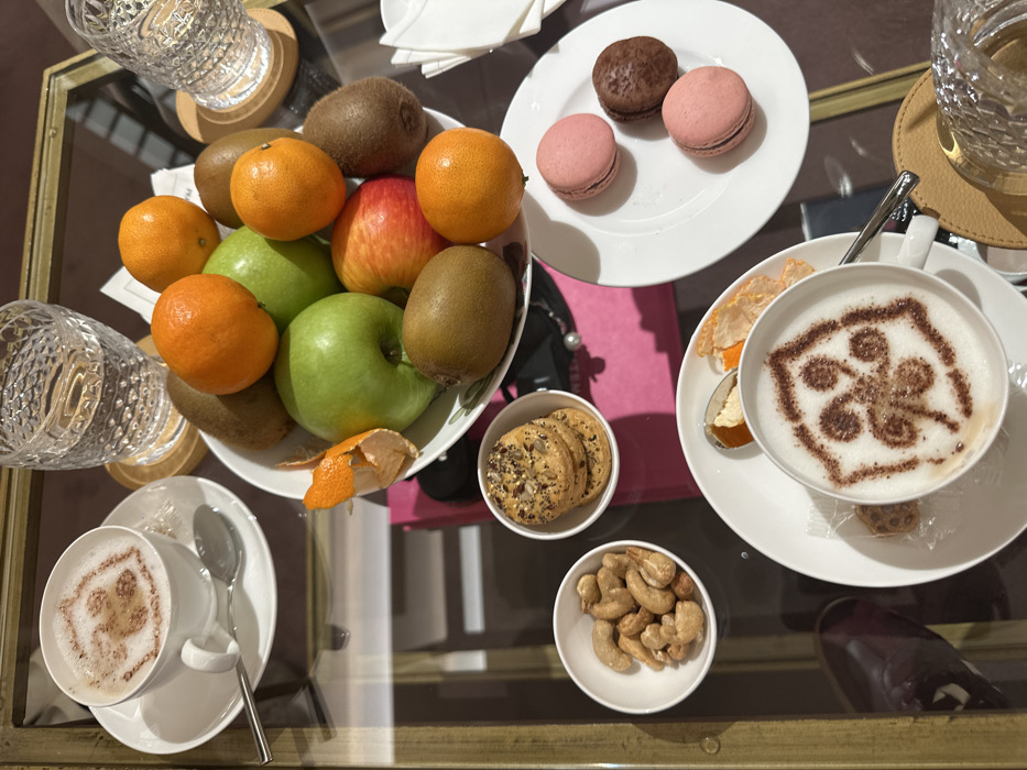 The image displays an overhead view of a glass-topped table set with various food and beverage items in an indoor setting in Serris, France. The table features a golden metallic frame, and reflections on its surface show ambient lighting and a dark object, possibly footwear, below. A bright pink object is partially visible underneath the glass. On the table, two white ceramic cups contain cappuccinos with cocoa powder art; one depicts a house-like outline with an internal shape, and the other shows a stylized quatrefoil design. Each cup rests on a white saucer with a silver spoon. Two clear, cut-glass tumblers filled with water are present, each on a light brown circular coaster. A white ceramic fruit bowl centrally holds assorted fruits: four green apples, one red-and-yellow apple, four oranges/clementines, and four kiwis. A piece of orange peel is draped over the rim of the fruit bowl. A separate small white bowl contains a pile of roasted cashews. Another small white bowl contains a stack of five round, seed-topped crackers. A white round plate holds three macarons: two pink and one dark brown. Additional orange peel fragments are visible on one of the cappuccino saucers, and a small, individually wrapped hexagonal-shaped cookie or biscuit lies beside the second cappuccino.