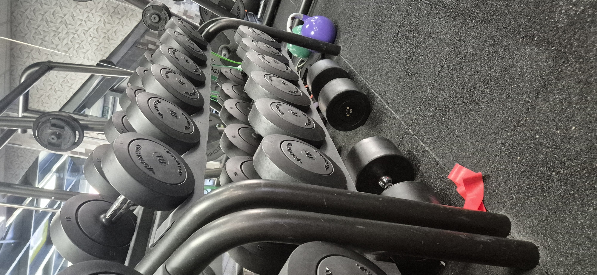 The image depicts a rack of dumbbells and other workout equipment in what appears to be a gym