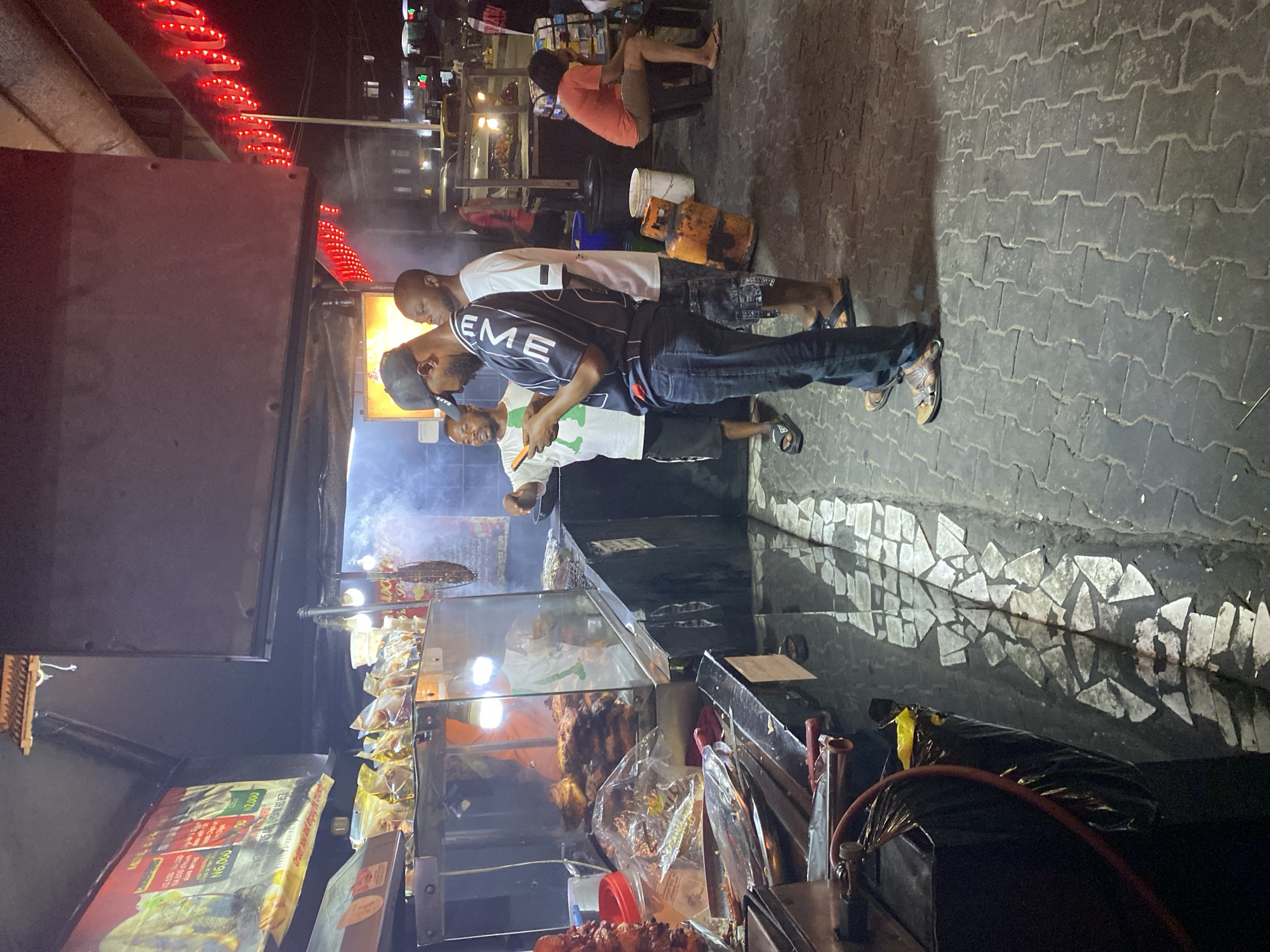 street food vendor in Ado, Nigeria at night. Three men are standing near a food stall, looking at the food or interacting with the vendor. The vendor is partially obscured by the men and the stall. The stall contains a variety of foods, including what appears to be grilled meat and packaged snacks. Red decorative lights are visible in the background. The ground is paved with interlocking blocks. There are other people in the background, sitting and standing near the stall. A propane tank and other cooking equipment are visible near the vendor.