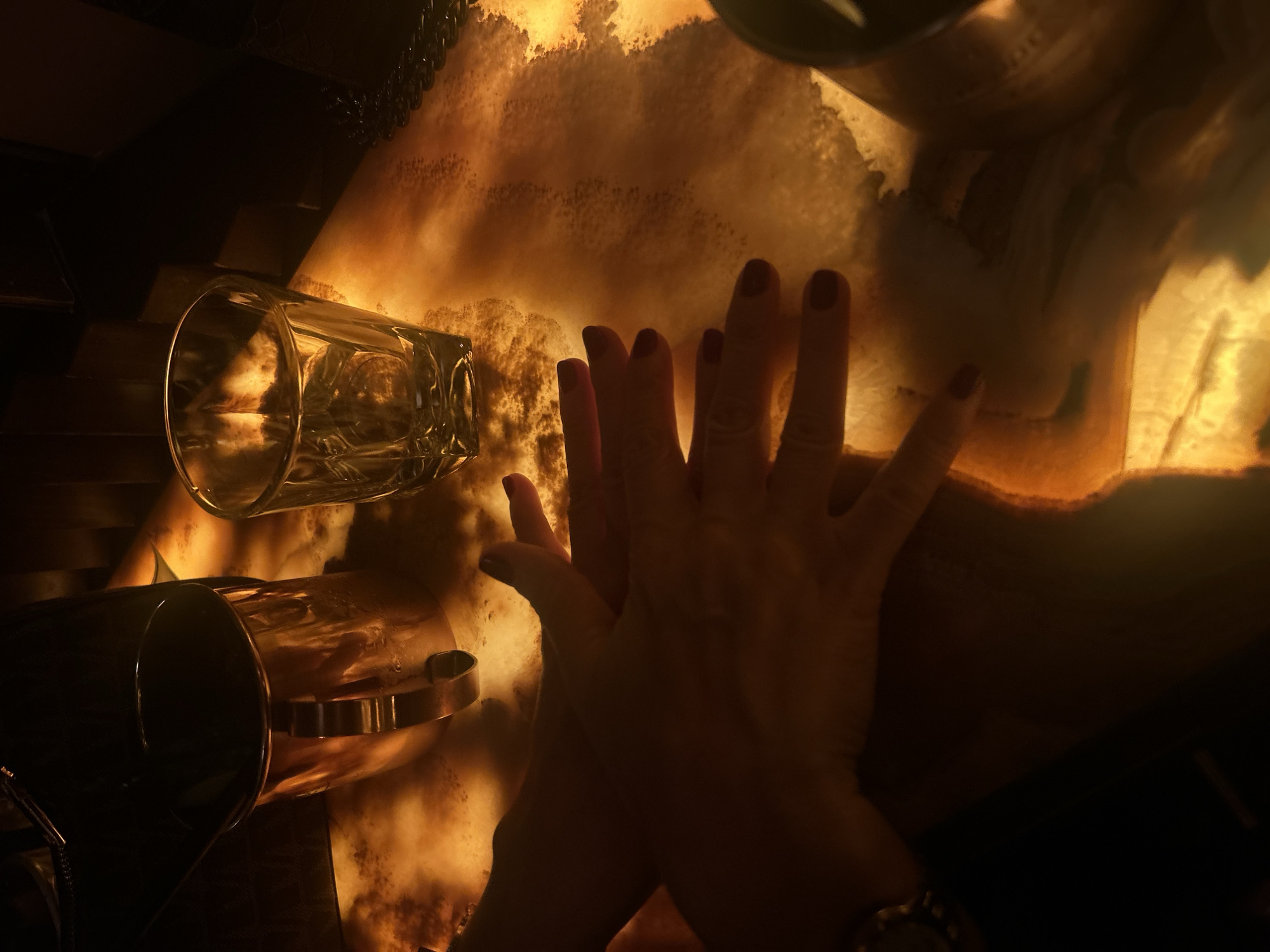The scene is set indoors in Vienna, Austria, characterized by a dimly lit environment with a prominent translucent surface, likely a table or bar top, illuminated from beneath by a warm orange-yellow light. Centrally positioned on this glowing surface are two human hands, appearing feminine, with neatly manicured fingernails painted a dark red or burgundy color. One hand rests atop the other, fingers splayed. A watch with a dark strap and circular face is visible on the wrist of the lower hand, on the left side of the frame. To the upper left of the hands, a metallic, possibly copper or brass, handled mug or pitcher is present, appearing partially full. An empty, clear, faceted glass tumbler is positioned further to the right of the mug. A portion of a second metallic object is visible on the far right edge of the frame. No active interaction between the hands and the drinking vessels is observed; the hands are static.