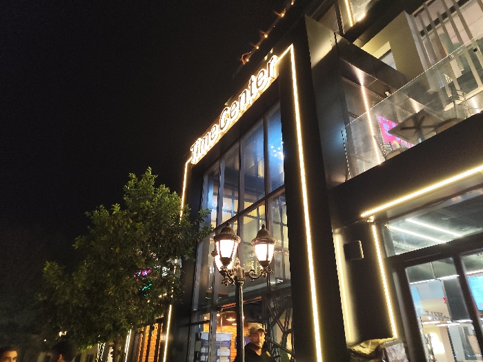 The image depicts an exterior night scene in an urban environment, identified as Joubar Municipality, Syria. The primary subject is a multi-story commercial building with a modern facade constructed from dark materials and extensive glass panels. The building features prominent external linear LED lighting strips, outlining its structure vertically and horizontally in a warm white glow. A large, illuminated sign on the upper section of the building reads "Time Center." An upper-level balcony or terrace with a glass railing is visible on the right side of the building, showing at least one outdoor table and chairs. The interior of the building is illuminated, revealing further modern lighting fixtures. In front of the building, a double-headed, ornate streetlamp with warm, amber-colored light fixtures stands prominently. To the left of the building, a dense green tree is visible, adorned with small, multicolored decorative lights. At the bottom of the frame, two individuals are partially visible. One individual, wearing a cap, is positioned near the base of the streetlamp, facing generally towards the viewer. Another person's head and shoulder are observable in the extreme bottom-left corner. No specific actions or interactions between the individuals are discernible beyond their presence. The sky is dark, indicating nighttime conditions.