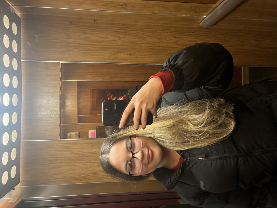 A woman is taking a selfie in an elevator. She is wearing glasses and a black puffer jacket with a red sweater underneath. Her blonde hair is partially covering her face. The elevator's interior features wooden walls and a mirrored panel reflecting an endless hallway effect. A column with circular lights is on the left side of the frame.