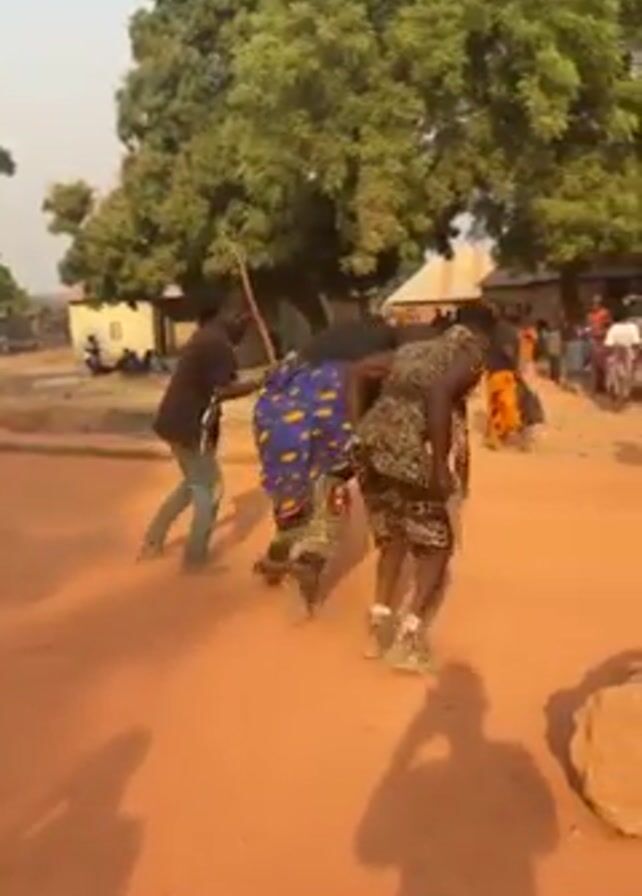 group of people dancing on a dirt ground in what appears to be a rural village. Three people are in the foreground dancing. One of them is wearing a dark shirt and jeans and carrying a stick. Another is wearing a blue and yellow patterned cloth. The third dancer is wearing a leopard print dress. Other people are watching the dance, and there are trees and buildings in the background. The video is shaky and the lighting is bright.