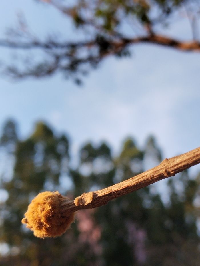 The image displays a sharply focused, brown-colored plant twig with longitudinal striations and small nodes, extending from the lower-left to the mid-right. A distinct spherical, fuzzy, orange-brown botanical formation is present at the left end of the twig. The background is out of focus, featuring a light blue sky in the upper half and blurred green masses of foliage, indicative of trees, in the lower and mid-ground. An indistinct dark tree branch is visible in the upper-left background. The scene is illuminated by natural daylight. No individuals, man-made structures, actions, or interactions are visible. This scene is located in Guacara, Venezuela.