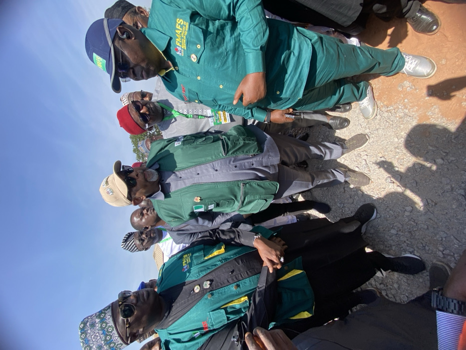 The image displays an outdoor gathering of approximately ten men in Gwagwada, Nigeria, under a clear blue sky. The ground consists of rough, unpaved light-colored gravel and reddish-brown soil, with distinct shadows cast by individuals from direct sunlight. In the foreground, three men are centrally positioned and engaged in interaction. 1. **Left figure:** A man with dark skin, wearing a patterned cap (blue, white, green, yellow), dark sunglasses, a black long-sleeved shirt, and a green vest with yellow accents and multiple pockets. Several pins or badges are visible on his chest, including one that appears to read "AFMAFMS". His hands are clasped in front of him, and he is looking towards the central figure. 2. **Central figure:** A man with a graying beard, wearing a beige baseball cap with an emblem, dark sunglasses, a gray collared shirt, and a dark green multi-pocketed vest. A Nigerian flag pin is affixed to his vest. His hands are in his pockets, and he is looking towards the rightmost figure. 3. **Right figure:** A man wearing a dark blue baseball cap with "FMAFS" in white lettering, dark sunglasses, and a long-sleeved green shirt. Patches on his shirt clearly read "FMAFS FEDERAL MINISTRY OF AGRICULTURE AND FOOD SECURITY". His right hand is raised with the index finger extended, appearing to gesture or emphasize a point towards the central figure. Several other men are partially visible in the background, some wearing various traditional caps (e.g., striped, red) and some with event lanyards. A faint outline of a light-colored building structure is visible in the distant background on the left.