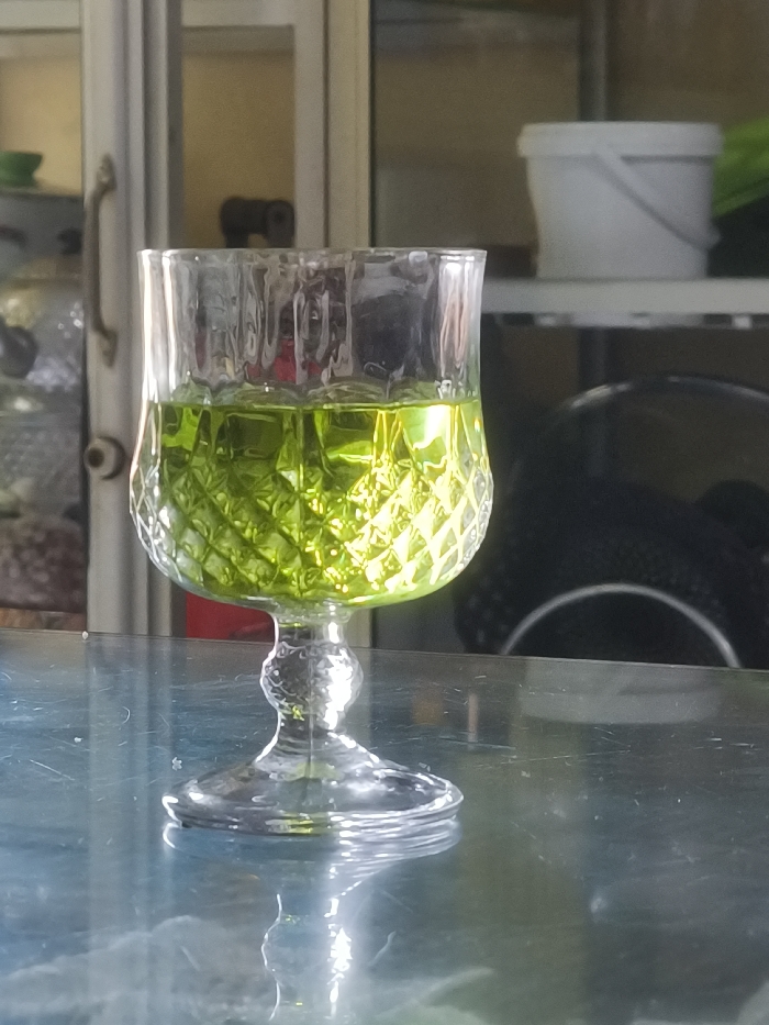 The scene is set indoors in Lhokseumawe, Indonesia. A clear glass goblet, featuring a diamond-patterned bowl and a textured stem and base, rests on a dark, reflective, scuffed surface. The goblet is filled approximately two-thirds with a translucent, vibrant light-green liquid, which reflects a bright light source. The background is out of focus. To the left, a light-colored cabinet with glass panel doors and a brass handle is visible, containing indistinct items, including a small green bowl. To the right, a white plastic bucket with a lid and handle is positioned on a shelf. Below and to the right of the bucket, a dark, possibly ribbed object with a circular design is partially visible. No individuals or specific actions are depicted.