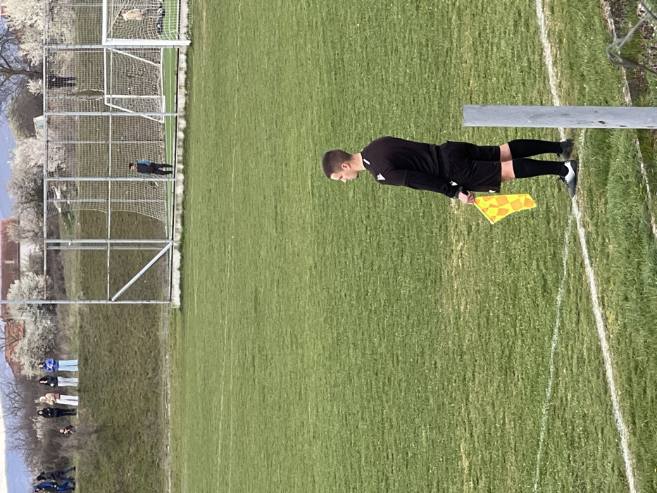 An outdoor scene in Koprivlen, Bulgaria, depicts a soccer field and its immediate surroundings under overcast skies. In the foreground, a male assistant referee, wearing a black long-sleeved shirt, black shorts, black socks, and black and white athletic shoes, stands on a green grass field. He holds a yellow and orange checkered flag in his right hand, positioned near a white sideline marking. His gaze is directed to the right, away from the camera. A grey metal post is partially visible in the lower right. In the midground, behind the referee and the sideline, a metal fence encloses a section of the field featuring two soccer goal nets. A person in dark attire stands inside the fenced area to the left of the left goal net. The background shows a grassy embankment rising behind the fence. Approximately seven individuals, dressed in various casual clothing, are standing on top of this embankment, appearing to observe the field. Behind the embankment, residential buildings with reddish roofs and trees, some displaying white blossoms, are visible against the horizon.