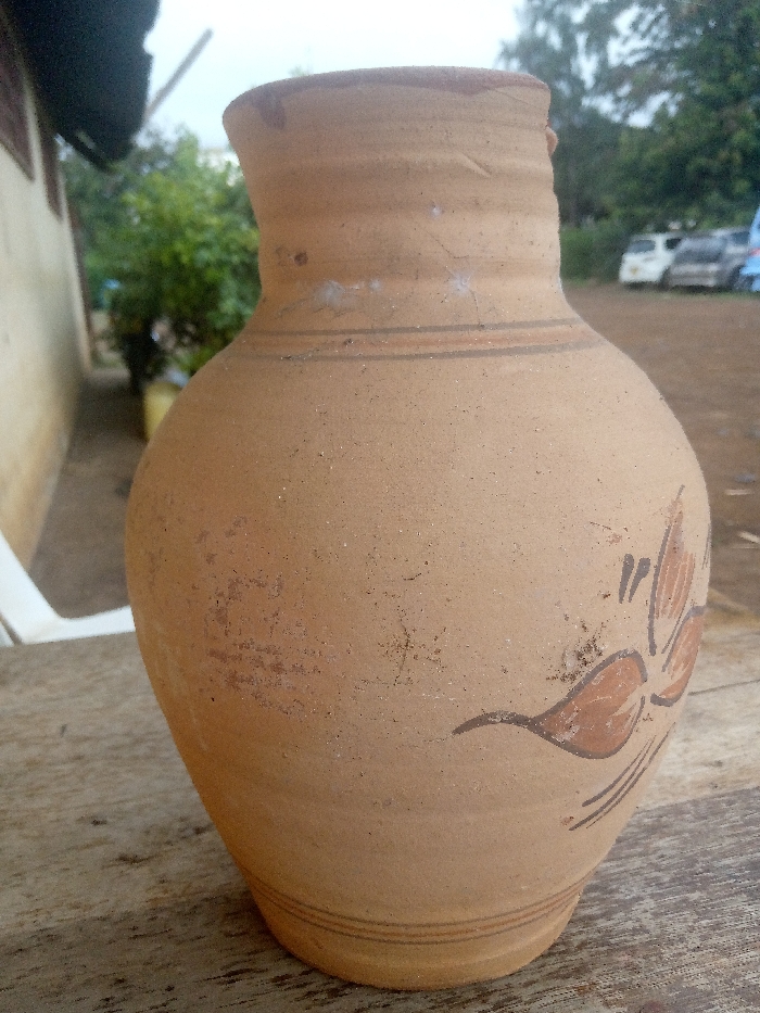- "The image displays a weathered, unglazed terracotta pot positioned on a light-colored wooden surface in an outdoor setting in Kisumu, Kenya" by FM-izhk62, licensed under CC BY 4.0