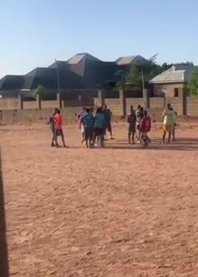 The video depicts a group of approximately 15-20 individuals, primarily young males, gathered in an open, dusty field
