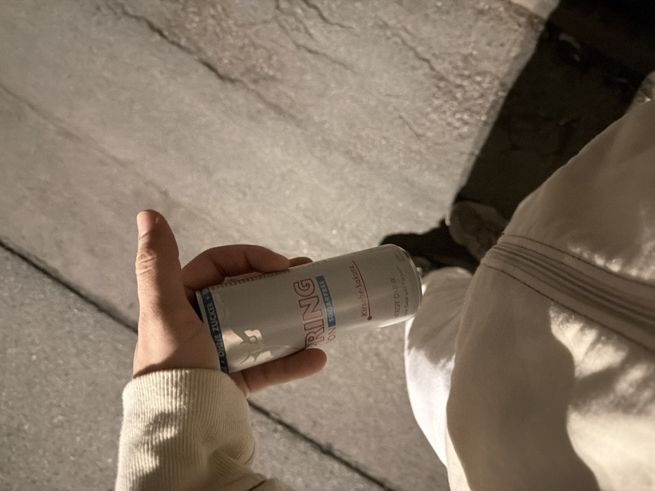 The image presents a downward-angled, first-person perspective, focusing on a person's right hand holding a beverage can. The scene is located in Fürth, Germany. The hand, with fingers curled around the can, emerges from a light-colored, long-sleeved garment. Below the hand, a portion of a light-colored lower body garment, possibly trousers or sweatpants with visible seams, is visible. A dark shoe or boot is partially discernible at the bottom center. The object held is a white and silver cylindrical metallic can, labeled "SPRING ON SUGARFREE" with "Kirsche-Sakura" (Cherry-Sakura) flavor text and "ENERGY DRINK." The German phrase "OHNE ZUCKER" (sugar-free) is prominent near the top. A stylized bull or buffalo head logo is also visible. The can appears to be intact and unopened. The immediate environment consists of a textured, grey paved surface, likely concrete or flagstone, showing distinct seams and variations in tone. The illumination is dim, suggesting either low light conditions or nighttime under artificial light, which casts subtle shadows. No other individuals or significant objects are present within the frame.