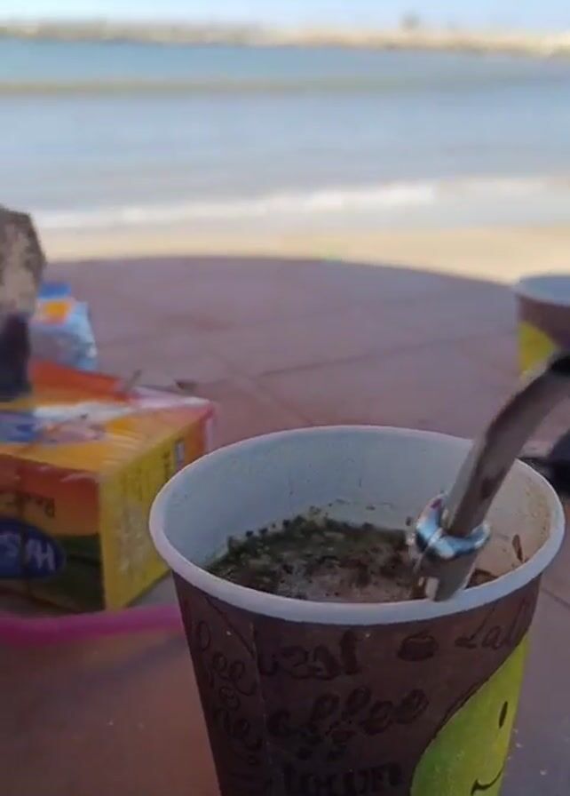view from a beach table with a cup of yerba mate in the foreground. Behind it, there’s a box of cookies and another cup. The camera pans to show the beach with waves and a pier in the distance. Then the camera pans back over the table showing various bottles and items scattered around. Finally, the camera pans to a hookah on the beach.