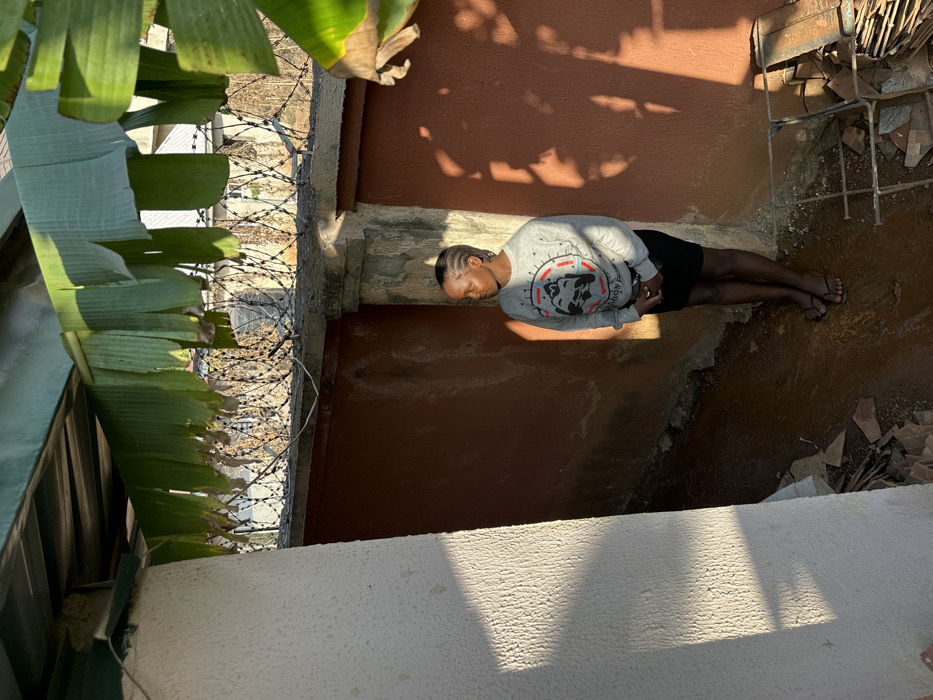 A female individual stands in an outdoor area within Agbogugu, Nigeria. The subject, with dark skin and short, braided hair, wears a grey long-sleeved sweatshirt featuring a graphic design with text, a black skirt, and black sandals. She is positioned facing slightly right, with her head turned to look towards the right out of frame, hands clasped in front. To her immediate left is a light-colored, textured wall illuminated by direct sunlight, casting shadows. Behind her is a reddish-brown wall, discolored in areas, displaying prominent shadow patterns from overhead vegetation and structures. The ground beneath is uneven, appearing wet and muddy, with scattered debris including broken tile fragments and metal scraps. Above, green banana leaves hang from a green corrugated metal roof structure. In the background, above the reddish-brown wall, a concrete perimeter wall is topped with multiple coils of barbed wire. Distant buildings and sparse vegetation are visible beyond the barbed wire under bright daylight conditions.