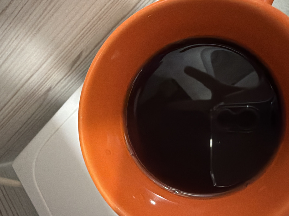 An orange mug is filled with a dark liquid, likely coffee or tea, creating a reflective surface
