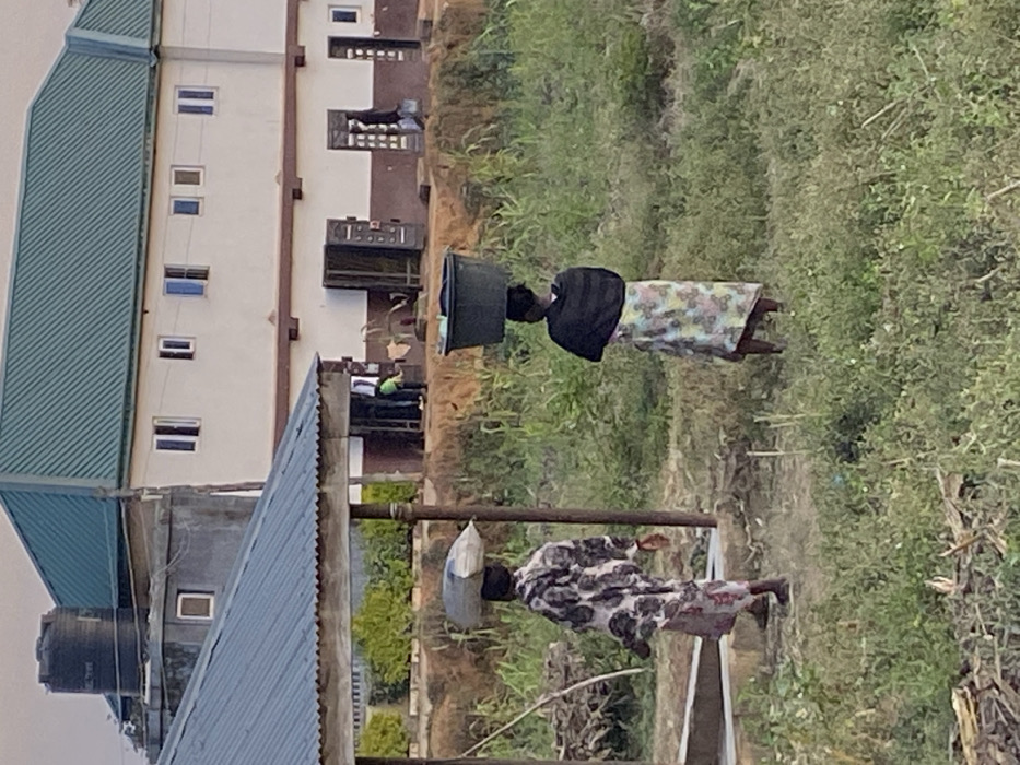 The image displays a semi-urban landscape in Udu, Nigeria. In the midground, two women are present amidst an area of unkempt green and brown vegetation. The woman on the left wears a patterned tunic over a long skirt and carries a light-colored, possibly fabric, sack on her head. She stands near a concrete structure partially covered by a corrugated metal roof supported by wooden posts. The woman on the right wears a dark top over a light-colored, floral-patterned long skirt and carries a dark-colored plastic bucket on her head, facing away from the viewer. In the background, a two-story residential building with a light-colored facade and a dark green corrugated metal roof is visible. The building features several rectangular windows with vertical dividers and multiple open ground-floor doorways. To the left of this building, a smaller concrete structure with a dark water tank on its roof is partially visible. Faint figures are discernible near the ground-floor doorways of the main building, including one individual in a light green top. A reddish-brown dirt embankment separates the overgrown vegetation of the midground from the background buildings. The scene is illuminated by natural daylight.