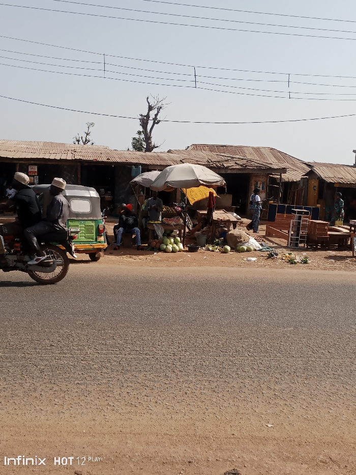 A street scene under a clear sky shows a motorcycle with two riders moving left. Market stalls line the roadside, with vendors selling produce like watermelons. People are present around the stalls. Buildings with corrugated iron roofs are in the background. Power lines run across the top of the frame. The road surface dominates the foreground, with some dirt visible at the bottom.