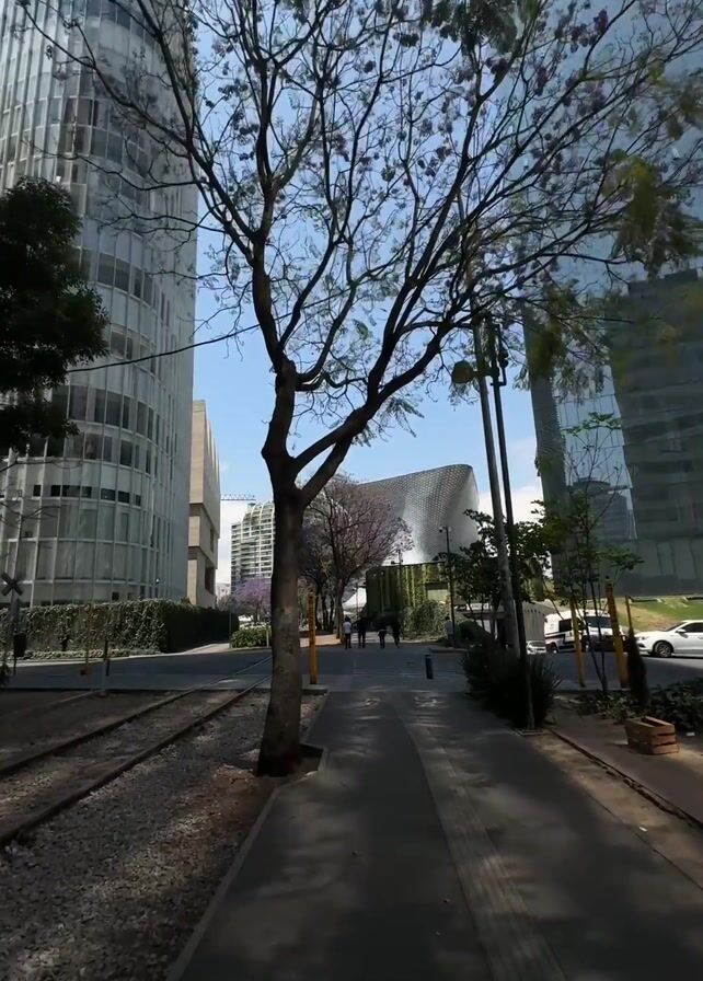street scene with modern buildings on either side and a sidewalk in the foreground. A bare tree with a few budding flowers stands between the camera and the street. To the left of the sidewalk are old train tracks filled with gravel. Several people are walking across the street in the distance, and a white car drives on the right side of the road. The sky is blue with some scattered clouds.