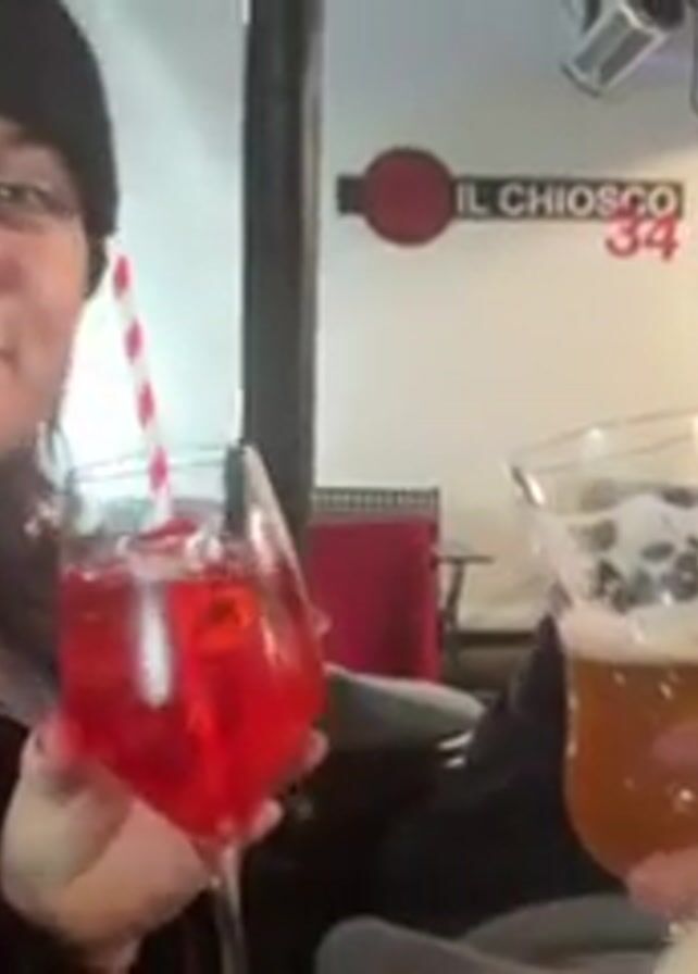 Two people, a woman and a man, are sitting at a table inside a cafe or restaurant. The woman is on the left wearing a black beanie, a brown coat, and earrings. She holds a wine glass filled with a red drink and a striped straw. The man is on the right, also wearing a black beanie, and a jacket with a yellow collar. He holds a beer glass. They are making a toast. Behind them is a sign that reads "IL CHIOSCO 34." The lighting is soft and natural.