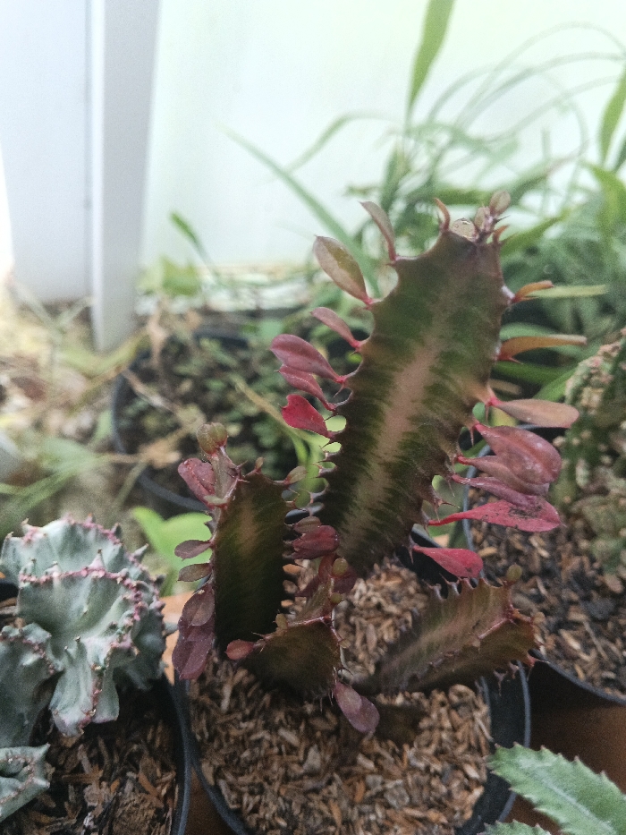 The image displays a close-up view of several potted succulents in Munyati, Zimbabwe. Dominating the center is a multi-stemmed succulent, characterized by dark green, ribbed stems with prominent reddish-brown margins and small, oval, reddish-pink leaves protruding along the ridges. This plant is situated in a black plastic pot filled with a substrate primarily composed of wood chips or bark mulch. To the left, a second succulent with a grayish-green, wavy or crested form, accented by reddish-pink tips and margins, is visible in a similar black plastic pot with the same substrate. The background is softly blurred, revealing additional green foliage, including taller, grass-like plants and other indistinct potted plants. A light-colored, vertical structure, possibly a wall or support, is present in the far left background. No people are visible, and no actions or interactions are depicted. The scene suggests a cultivated indoor or outdoor plant display.