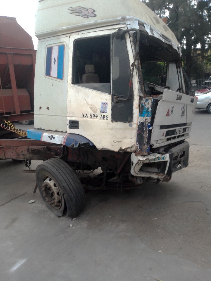 - "The scene depicts a severely damaged white Iveco heavy-duty truck cab, stationary on a paved surface in Ikeja, Nigeria" by FM-e0XNM2, licensed under CC BY 4.0