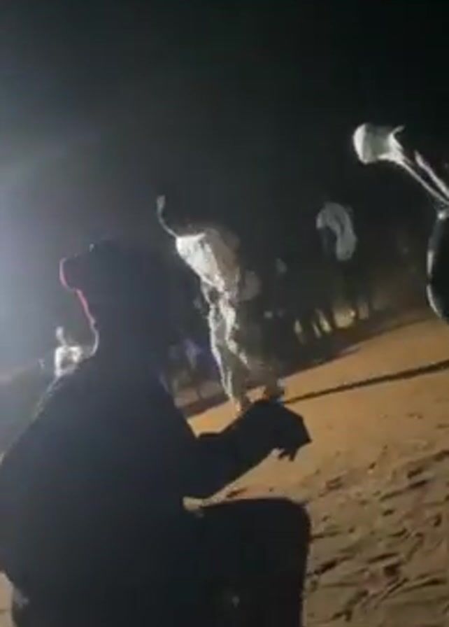 n outdoor gathering at night, likely a celebration. A person wearing a red hat and a dark outfit is crouching in the foreground, partially obscuring the view. In the middle ground, several people are dancing on a sandy or dusty surface, illuminated by dim light sources. Some dancers wear white or light-colored clothing, which stands out against the darkness. The background is dark and blurry, suggesting the presence of more people and possibly some structures or vehicles, though they are not clearly visible. The general atmosphere suggests a festive, though dimly lit, social event.
