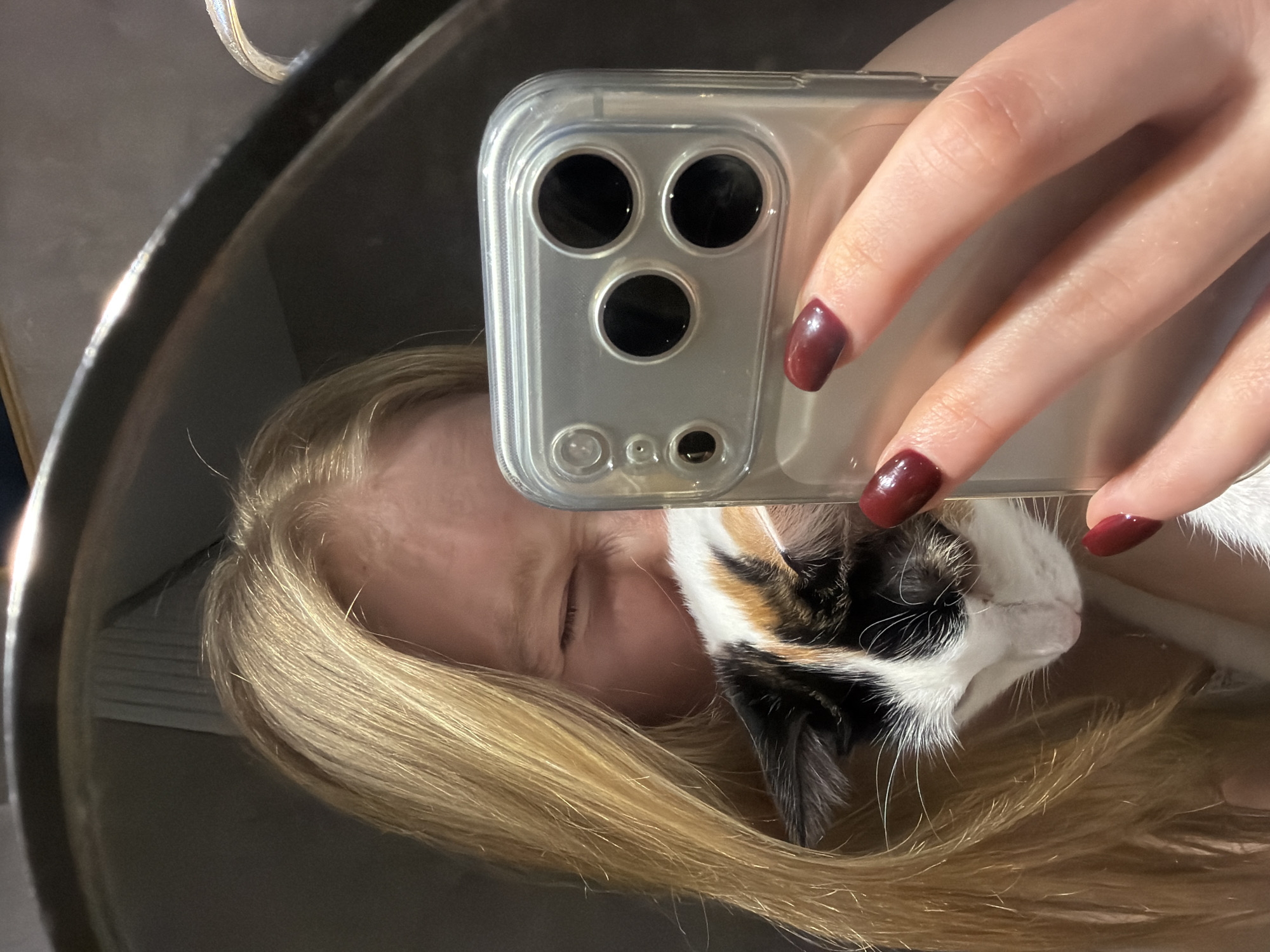 A selfie taken with a smartphone shows a fair-skinned person with closed eyes and long blonde hair, cuddling a calico cat