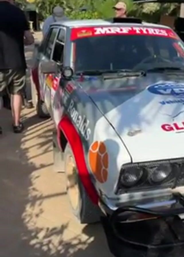 The video features a rally car with various decals and sponsors, including "MRF Tyres," "Ronalds," "VDI," and "Glen Edmunds Advanced Driving." The car is predominantly white with red and grey accents and a black front bumper guard. People are standing around the vehicle, some taking pictures. The setting appears to be an outdoor area with trees and a building in the background.