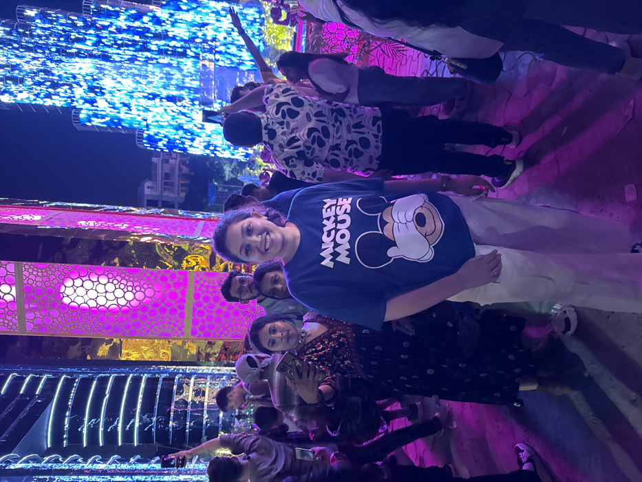The image displays a crowded nighttime scene in Bidhannagar, India, illuminated by extensive light installations. In the foreground, a woman with dark hair, wearing a blue "Mickey Mouse" t-shirt (depicting Mickey with covered eyes) and light-colored pants, stands smiling directly at the camera. To her left, a woman in a dark patterned dress with a choker necklace holds a smartphone at arm's length, angled away from the camera, seemingly taking a photo or video. To the right and slightly behind the primary subject, a man in a black and white patterned shirt holds a smartphone vertically, pointed towards the illuminated background. Numerous other individuals are visible throughout the mid-ground and background, many holding phones or observing the scene. The environment features multiple tall, brightly lit structures: a blue horizontally striped tower on the far left, two rectangular pillars in the center exhibiting intricate magenta and yellow patterns (one with a prominent circular motif), and a shimmering blue light installation resembling a digital waterfall on the right. A multi-story building is visible in the distant background against the dark night sky. The ground beneath the crowd reflects the colorful light from the installations.