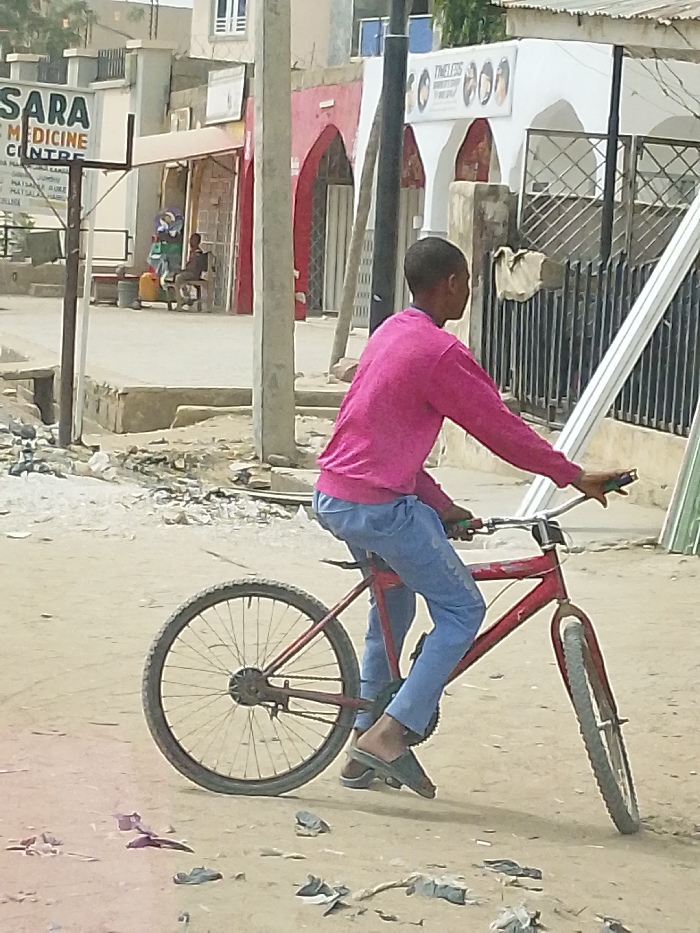 A young male is depicted riding a red bicycle on an unpaved, dusty road in Hotoro North, Nigeria
